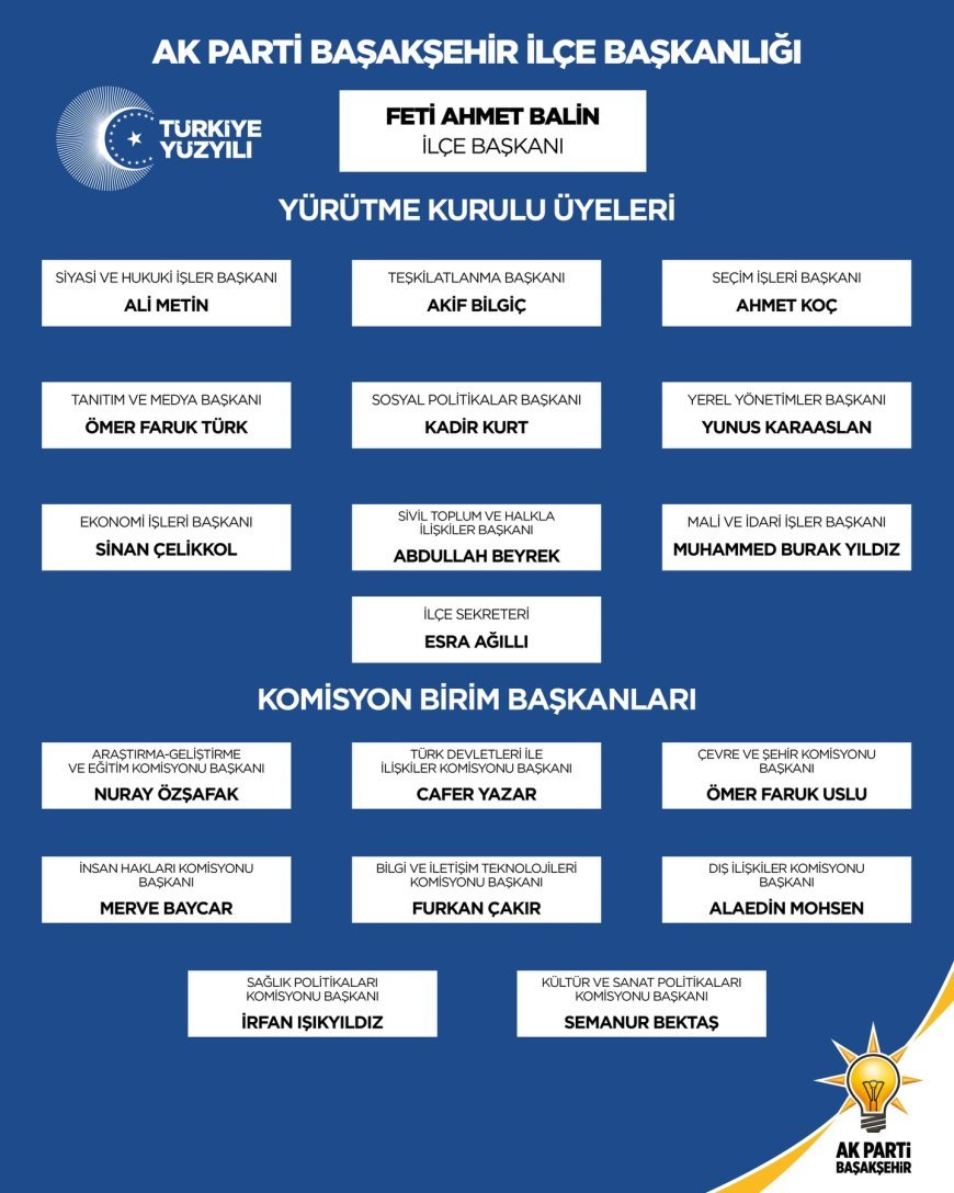Adalet ve Kalkınma Partisi Başakşehir İlçe Teşkilatı, yeni döneme güçlü bir başlangıç yaparak yenilenen yürütme kurulu ile sahadaki çalışmalarına hız verdi. İlçe Başkanı Feti Ahmet Balin öncülüğünde göreve başlayan yeni İlçe Yürütme Kurulu üyeleri, teşkilat çalışmalarını daha etkin ve dinamik bir yapıyla sürdürmeyi hedefliyor.