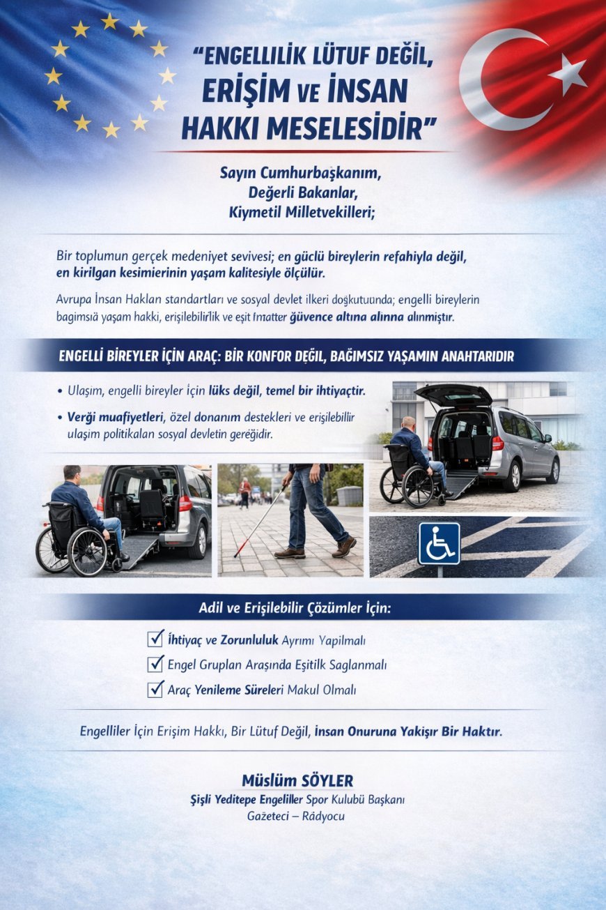 Unutulmamalıdır ki; toplumun en sabırlı, en dirençli ve en fedakâr kesimlerinden biri olan engelli bireyler için atılacak her doğru adım; yalnızca bir sosyal politika değil, aynı zamanda bir insanlık ve medeniyet göstergesidir.