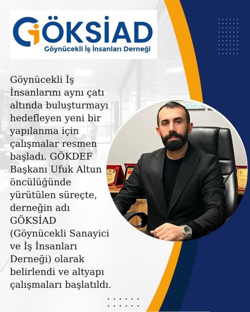 Göynücek’in ekonomik potansiyelini daha güçlü ve organize bir yapıyla geleceğe taşımayı amaçlayan önemli bir sivil toplum girişimi hayata geçiriliyor. Göynücekli iş insanlarını aynı çatı altında buluşturmayı hedefleyen Göynücekli Sanayici ve İş İnsanları Derneği (GÖKSİAD) için resmi hazırlık süreci başladı. Çalışmalar, GÖKDEF Başkanı Ufuk Altun’un öncülüğünde yürütülüyor.